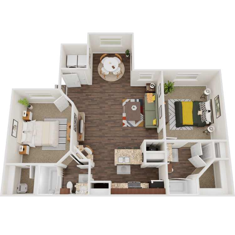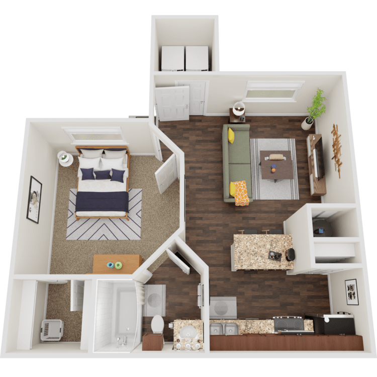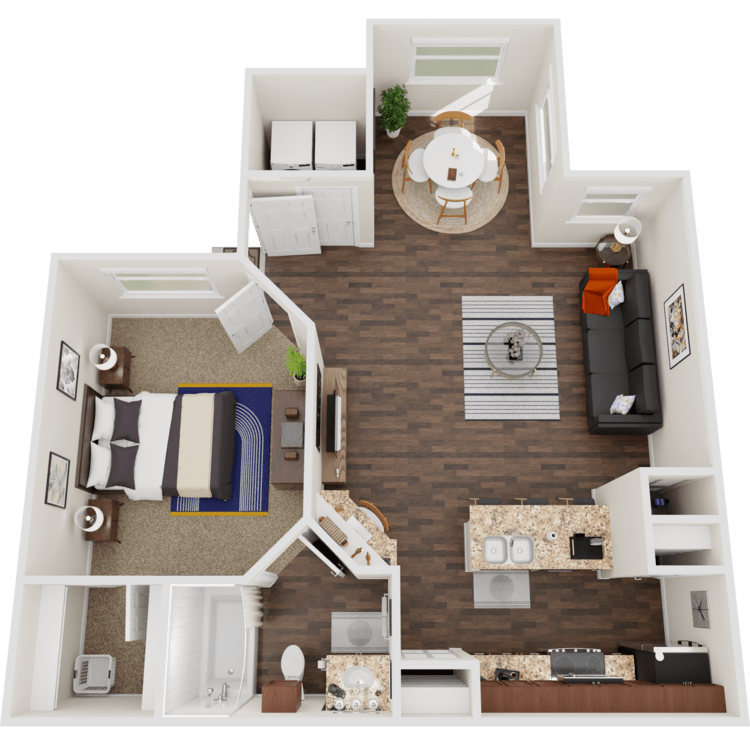 Our one and two-bedroom apartments for rent feature layouts designed for modern living and everyday comfort, with a convenient in-home washer and dryer. Each home includes an all-electric kitchen, and some residences offer vaulted ceilings. Air conditioning and ceiling fans will keep you cool when you need it, and details like hardwood and carpeted floors enhance your space.